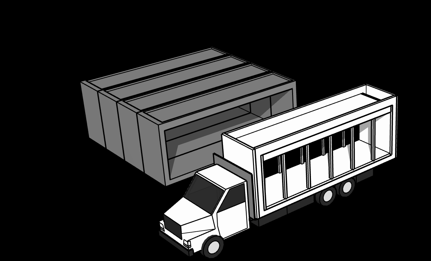 The Building Machine is transported to the site on a standard flatbed and quickly positioned for the first pour.